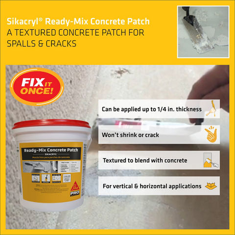 Sikacryl® Ready-Mix Concrete Patch is an easy to use, acrylic-based, textured concrete patch for repairing spalls and cracks in concrete and masonry that cures to a tough and durable finish.