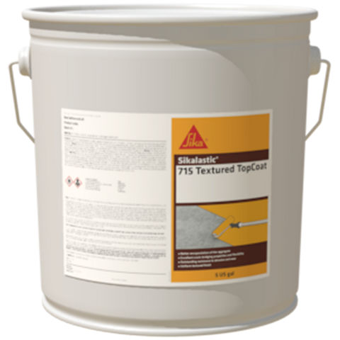 Sikalastic®-715 Textured TopCoat is a single component, UV-resistant, aromatic, moisture cured, elastomeric polyurethane coating intended for use as the traffic bearing wear and top coat over polyurethane waterproofing membrane for pedestrian and vehicular traffic bearing applications, and as a protective top coat over polyurethane waterproofing membrane under a separate wearing course such as concrete or asphalt pavement, and tile in a setting bed.