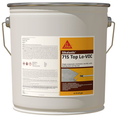 Sikalastic®-715 Top Lo-VOC is a single component, UV-resistant, aromatic, moisture cured, low VOC elastomeric polyurethane coating intended for use as the wear and top coat over polyurethane waterproofing membrane for pedestrian and vehicular traffic bearing applications, and as a protective top coat over polyurethane waterproofing membrane under a separate wearing course such as concrete, and tile in a setting bed. Optional Sikalastic® 700 ACL can be used to speed cure time.