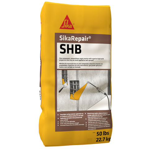 SikaRepair® SHB is a one-component, cementitious ready to use repair mortar. It is a multi-purpose mortar which can be applied by trowel or low pressure wet spray process. The incorporation of low density aggregates allows high build applications on vertical and overhead surfaces. SikaLatex® R or SikaLatex® may be used instead of water for a two component, polymer-modified repair mortar.