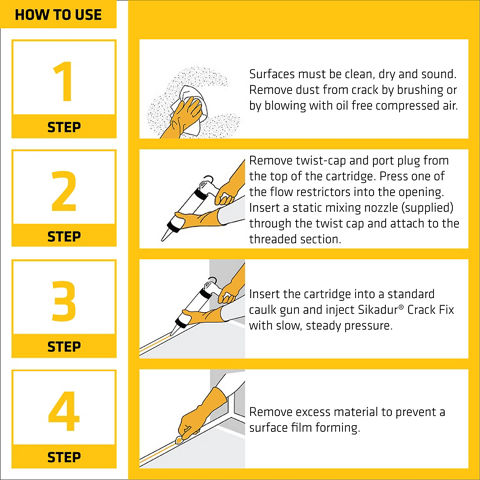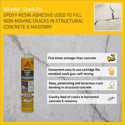 Sikadur® Crack Fix is a 2-component, 100 % solids, moisture-tolerant, low-viscosity, high-strength, multi-purpose, epoxy resin adhesive. It conforms to the current ASTM C-881 and AASHTO M-235 specifications.