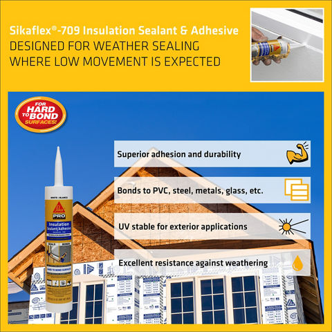 Sikaflex®-709 Insulation Sealant & Adhesive is a one component, gun grade, flashing sealant designed to adhere to a wide range of air, vapor and weather barrier surfaces. Sikaflex®-709 Insulation Sealant & Adhesive provides an excellent seal at transitions between dissimilar materials. Sikaflex®-709 Insulation Sealant & Adhesive can be used for weather sealing where low movement is expected.